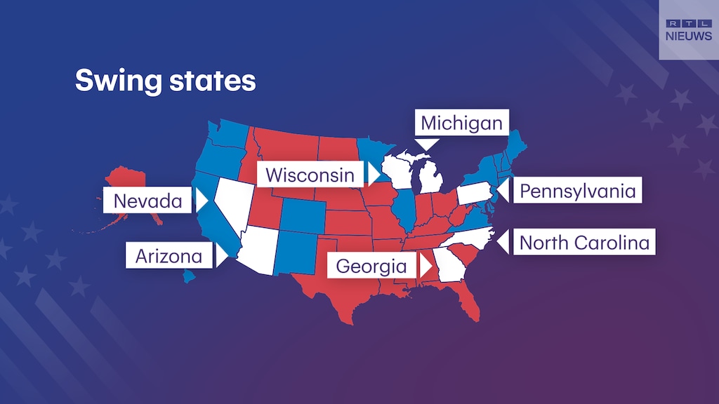 Deze verkiezingen zijn dat er volgens analisten zeven (te zien op de kaart hieronder). Het zijn stuk voor stuk sleutelstaten die vermoedelijk doorslaggevend zullen zijn voor wie de komende vier jaar de president van Amerika zal zijn.