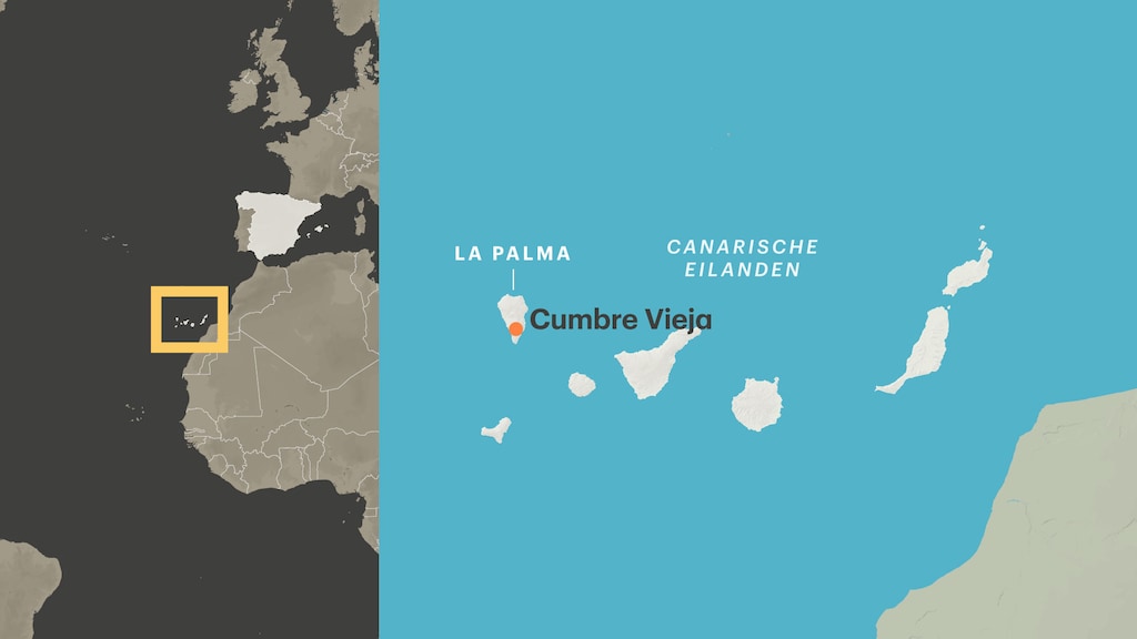 Ook in andere landen doet de serie het goed. Het draait allemaal om de vulkaan op het Canarische eiland. Dat is de Cumbre Vieja-vulkaan. Hieronder zie je waar La Palma en de vulkaan precies liggen: