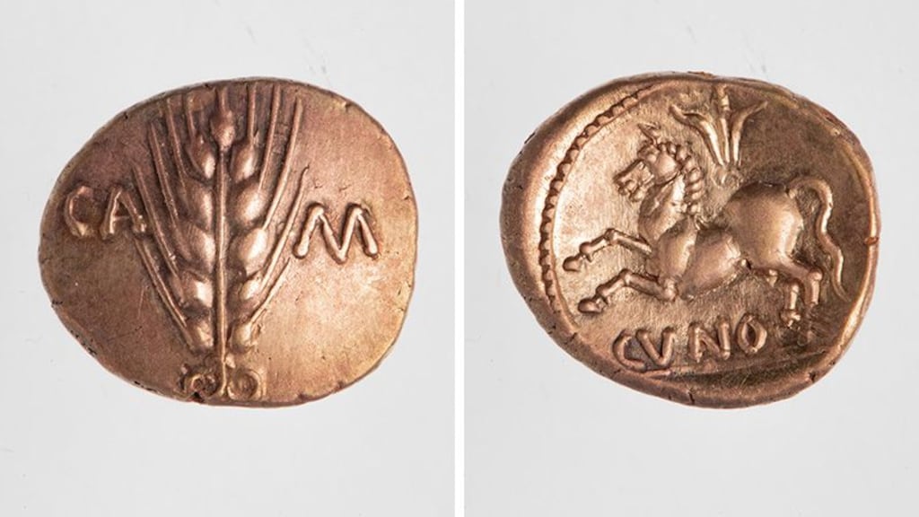 De Britse munten zijn zogeheten staters. Ze zijn niet van puur goud, legt het museum uit. De munten komen uit de tijd van de heerschappij van de Britse koning Cunobelinus en net daarna. De schat is vanaf nu te zien in het Rijksmuseum van Oudheden.