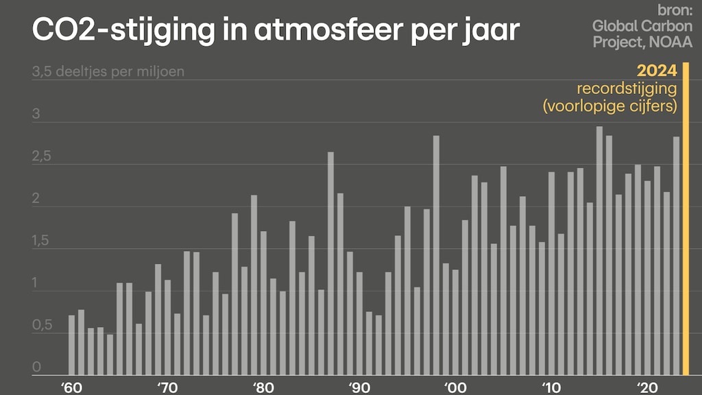 Het gaat om onderstaande grafiek. Wat je ziet, is de stijging van de concentratie CO2 in de atmosfeer. Samen met andere broeikasgassen zorgt deze stijging voor de opwarming van de aarde. CO2 is het belangrijkste broeikasgas. Die stijging versnelt. Klimaatwetenschapper Glen Peters schrijft op Bluesky: "Het is niet zomaar een record. Het is 25 procent hoger dan het vorige record."