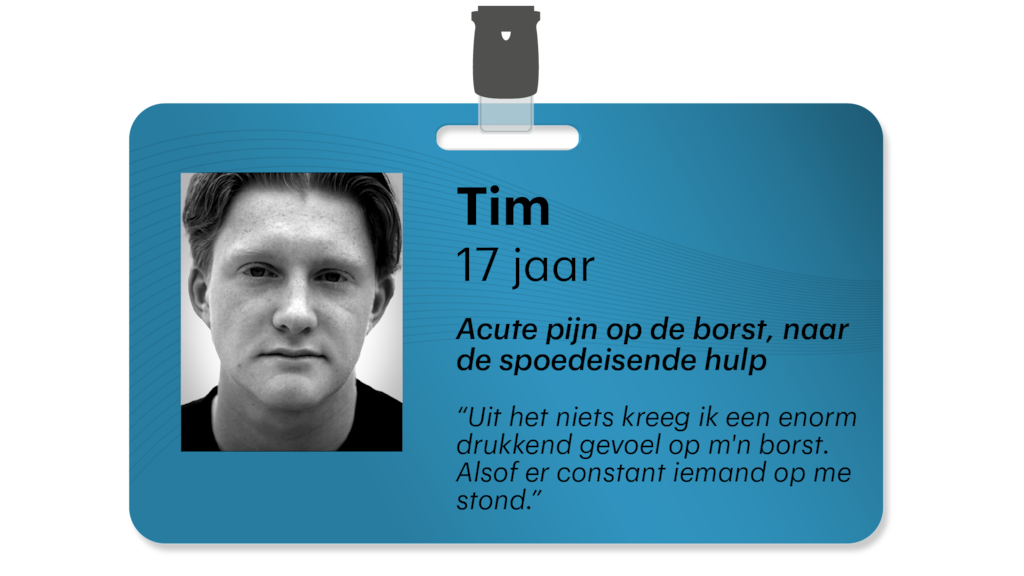 "Ik was aan het vapen en uit het niets kreeg ik een enorm drukkend gevoel op m'n borst. Alsof er constant iemand op me stond. De pijn straalde uit naar mijn armen en mijn nek, dus ik appte papa wat ik moest doen. Hij adviseerde om even rustig te gaan zitten op de bank. Op dat moment hoorde ik een heel raar plopje bij mijn hart, bij iedere hartslag. Toen schrok ik heel erg en raakte ik wel een beetje in paniek.