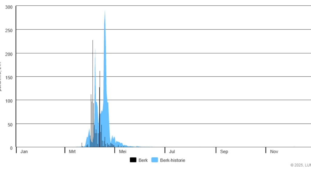 Hieronder zie je bijvoorbeeld de pollentelling van de berk, die vooral in maart heeft gepiekt.