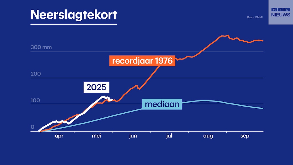 Dankzij de neerslag van de afgelopen week is het tekort wat gedaald tot 119 millimeter, gerekend vanaf 1 april. Tot half mei lag het neerslagtekort echter ongekend hoger, en zelfs nu zitten we nog boven de 5 procent droogste jaren en op koers met het recordjaar 1976.