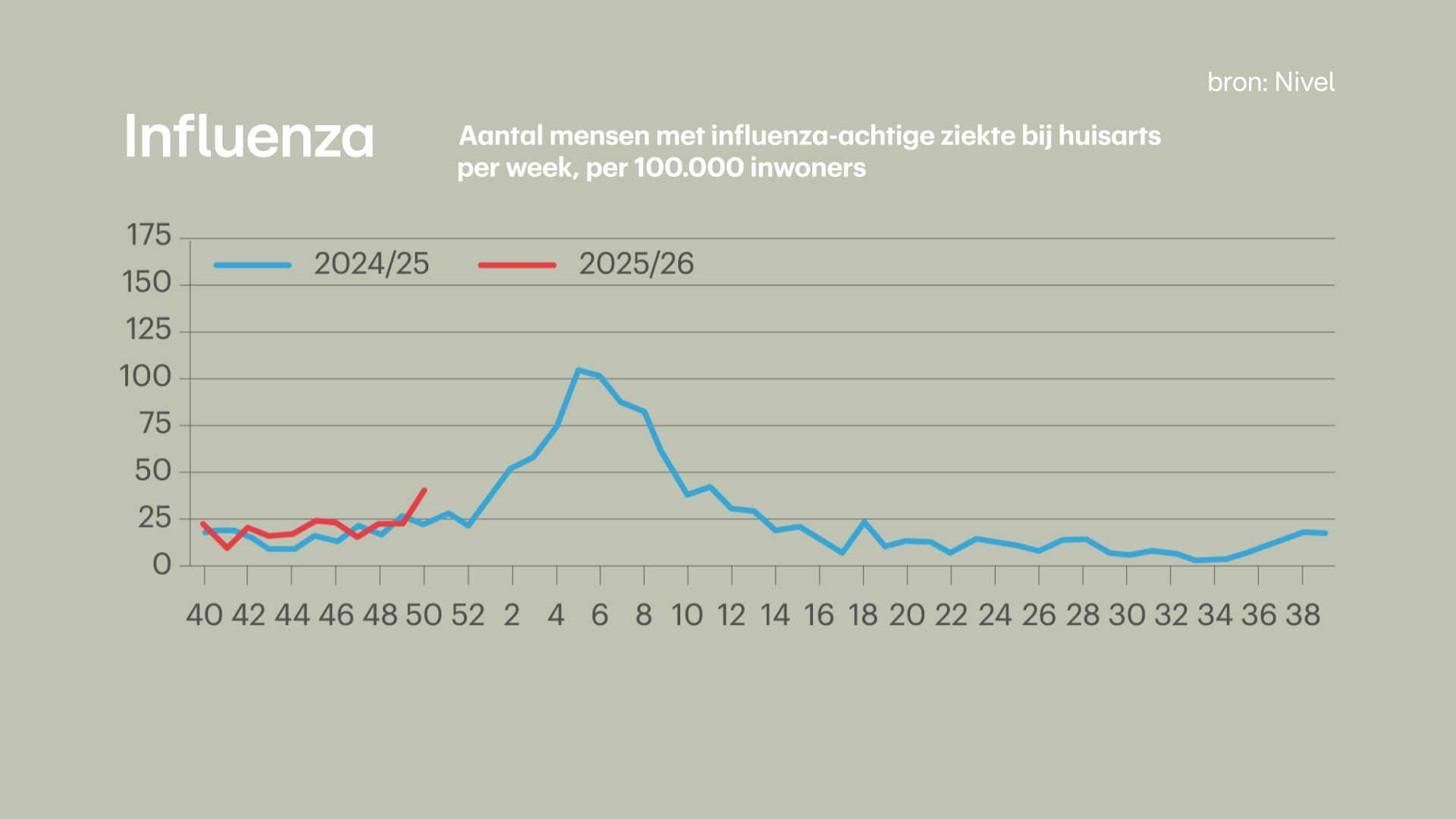 In de kerstvakantie wordt het normaal gesproken altijd iets minder, zegt Hooiveld. In januari neemt het vervolgens weer toe. Waarom er nu dan meer mensen ziek zijn? "Dat is speculeren: het kan nog een inhaaleffect zijn van corona. Al zou dat wel wat laat zijn." In coronatijd werden minder mensen ziek vanwege de maatregelen die golden en dus zijn ze minder immuun, ook voor de griep.