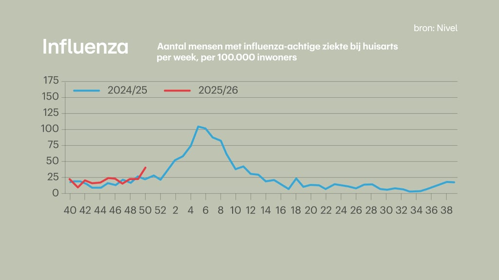 De griepcijfers stijgen harder dan vorig jaar, zegt onderzoeker Mariëtte Hooiveld van onderzoeksinstituut Nivel. Maar uniek is de situatie niet. In 2023 werd de stijging zelfs al eerder ingezet en in 2022 was het ongeveer zoals nu.