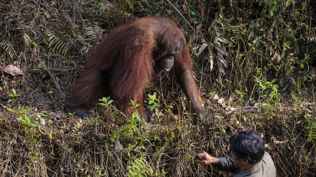 Uniek moment vastgelegd: orang-oetan geeft handje aan natuurbeschermer