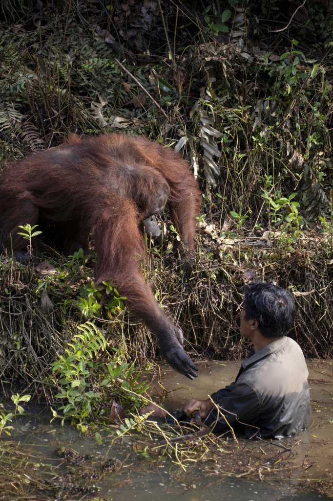 'Heb je hulp nodig?' Dat is wat deze orang-oetan misschien dacht toen hij zijn hand uitstak naar een medewerker van een beschermd natuurgebied in Borneo. Fotograaf Anil Prabhakar stond er met zijn neus bovenop en maakte een unieke foto.