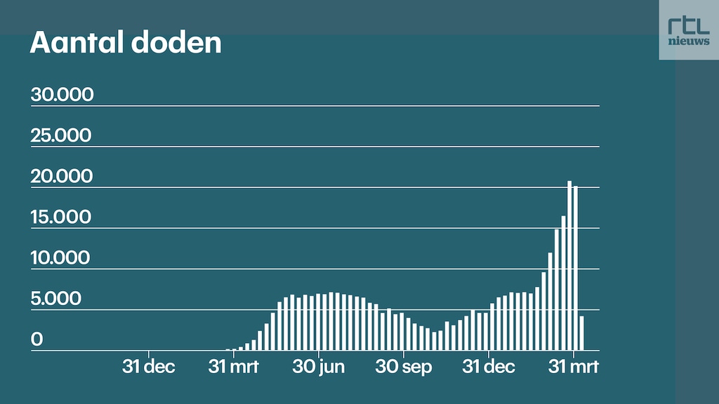 Nog veel opvallender is de grafiek met het aantal doden per week. De afgelopen weken was er niet alleen meermaals een record, bijna op elke doordeweekse dag werd het record zelfs verbroken.