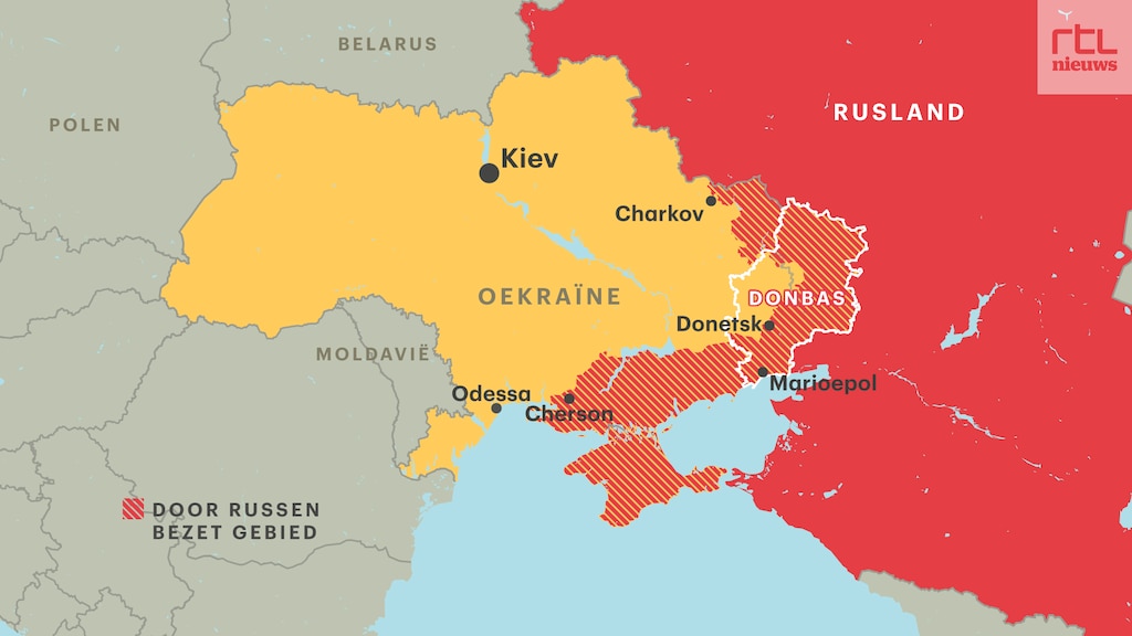 In het oosten en het zuiden van Oekraïne zijn inmiddels grote gebieden in handen van de Russische troepen. Het gaat om een gebied van de Krim, het schiereiland dat al in 2014 door Rusland werd geannexeerd, tot de Donbas-regio in het oosten. In die regio liggen de zelfverklaarde republieken Donetsk en Loehansk, waar pro-Russische separatisten de macht in handen hebben.