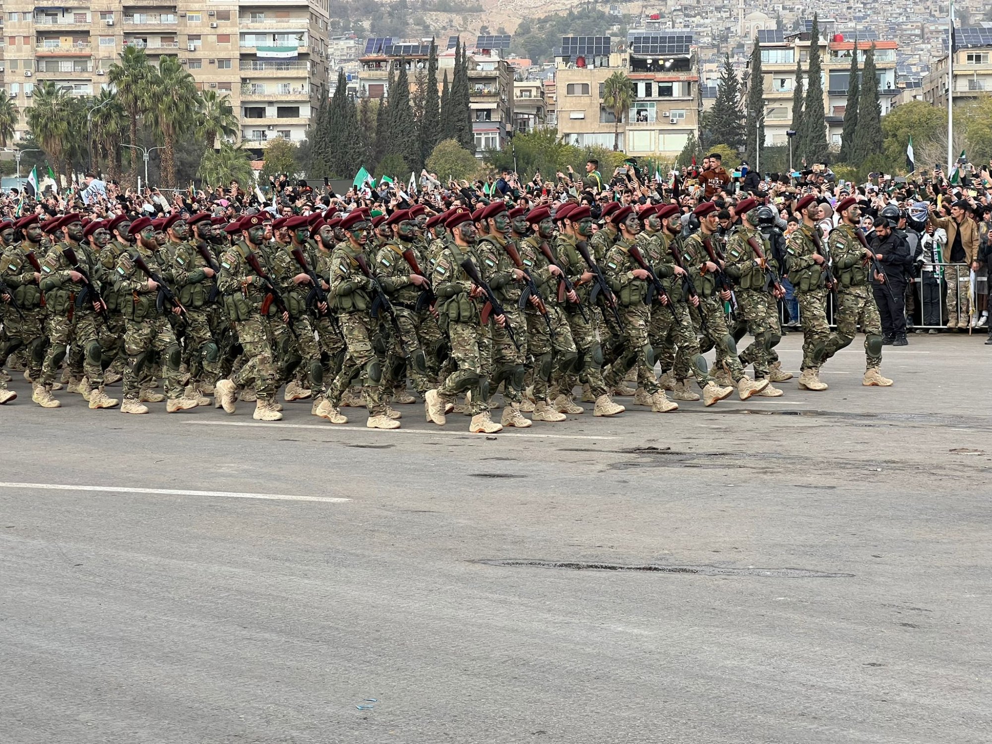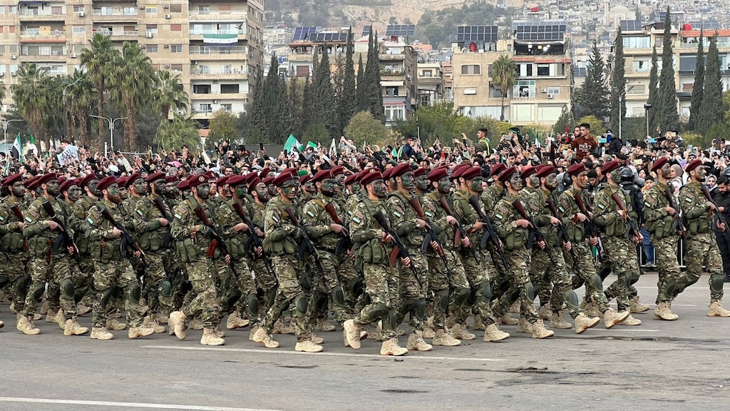 Parachutisten landden op het plein met vlaggen van het nieuwe Syrië. De parachuteshow wordt gevolgd door een militaire parade van het nieuwe Syrische leger. Er lopen veel soldaten en politie mee met in hun kleding rozen gestoken.