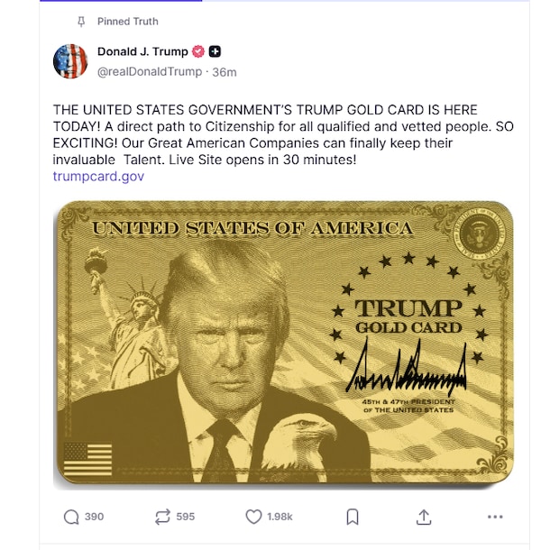 De Amerikaanse president Trump heeft op zijn sociale media de nieuwe Trump Gold Card aangekondigd. "Een directe weg naar burgerschap voor alle gekwalificeerde mensen."