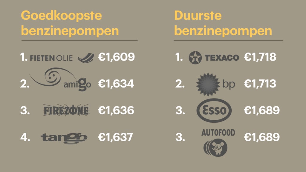 Kijken we naar de bemande pompen, dan is het Texaco voor zowel benzine (1,718 euro) als diesel (1,421 euro) het duurste. BP krijgt een eervolle een-na-duurste plek op de lijst. Het verschil bij BP tussen bemande en onbemande pompen is groot: zo’n 0,07 euro per liter.