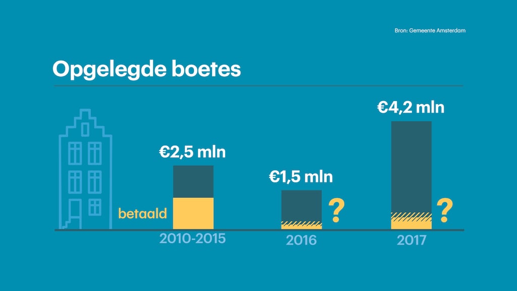 Zelfs met voldoende bewijs blijft het lastig om de verhuurder aan te pakken. De boetes zijn dan wel hoog (6000 tot 20.500 euro), maar innen blijkt lastig. Van alle boetes die zijn opgelegd tussen 2010 en 2016 is volgens de gemeente nog maar de helft betaald. In 2017 is voor 4,2 miljoen euro aan boetes uitgeschreven, maar ook daarvan is nog maar 'een klein deel betaald', laat de gemeente weten.