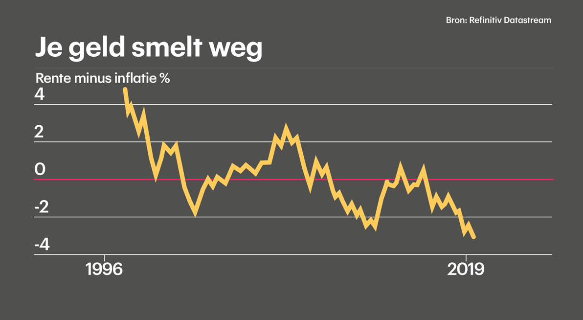 Bij de spaarrente van bijna 0 ga je er dus 3,1 procent op achteruit, laat beurscommentator Hans de Geus in onderstaande grafiek zien, waarin hij de reële rente afbeeldt.