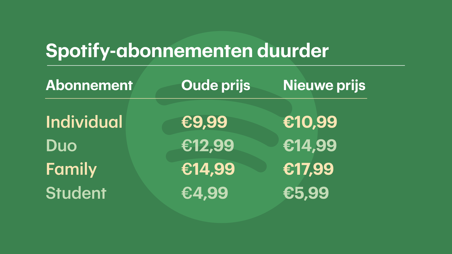 Een abonnement op muziekdienst Spotify is duurder geworden. De prijzen van de verschillende abonnementen gaan per vandaag met minimaal één euro omhoog. Daarmee volgt Spotify het voorbeeld van andere streamingdiensten.