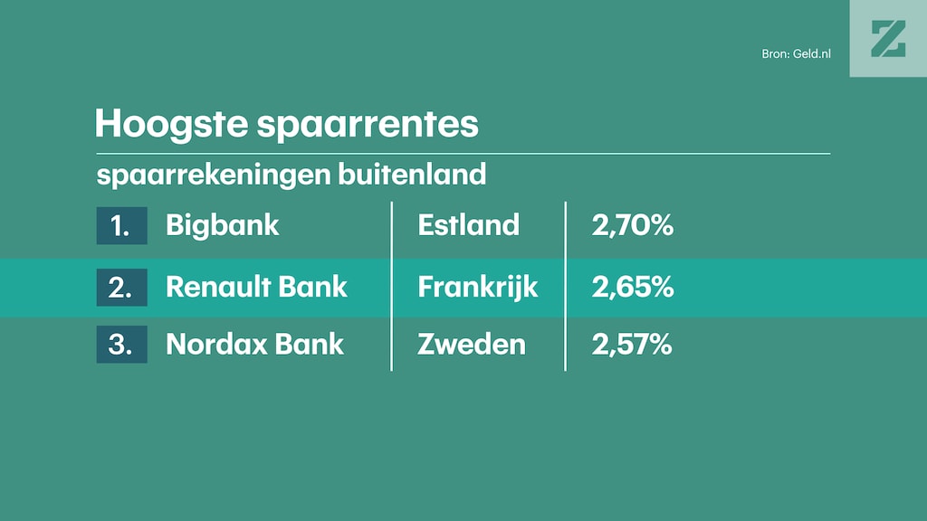 Ook bij banken in het buitenland, zoals in Spanje, Frankrijk of Estland, krijg je al snel meer dan 2,5 procent. Volgens Bulthuis moeten consumenten wel opletten of een bank onder het zogenoemde depositogarantiesysteem valt. Dat garandeert dat mensen geld terugkrijgen bij een faillissement van de bank, in elk geval tot 100.000 euro aan spaargeld.