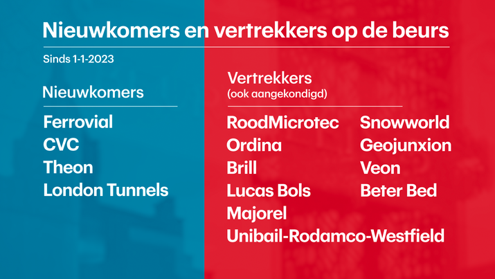 Lucas Bols zoals het bedrijf volledig heet, is met het opzeggen van de beursnotering niet uniek. Negen bedrijven gingen Bols sinds begin 2023 voor of hebben aangekondigd van de beurs af te gaan. Daar staan vier bedrijven tegenover die juist hun entree maakten op de Amsterdamse beurs. Je ziet ze in onderstaande illustratie.