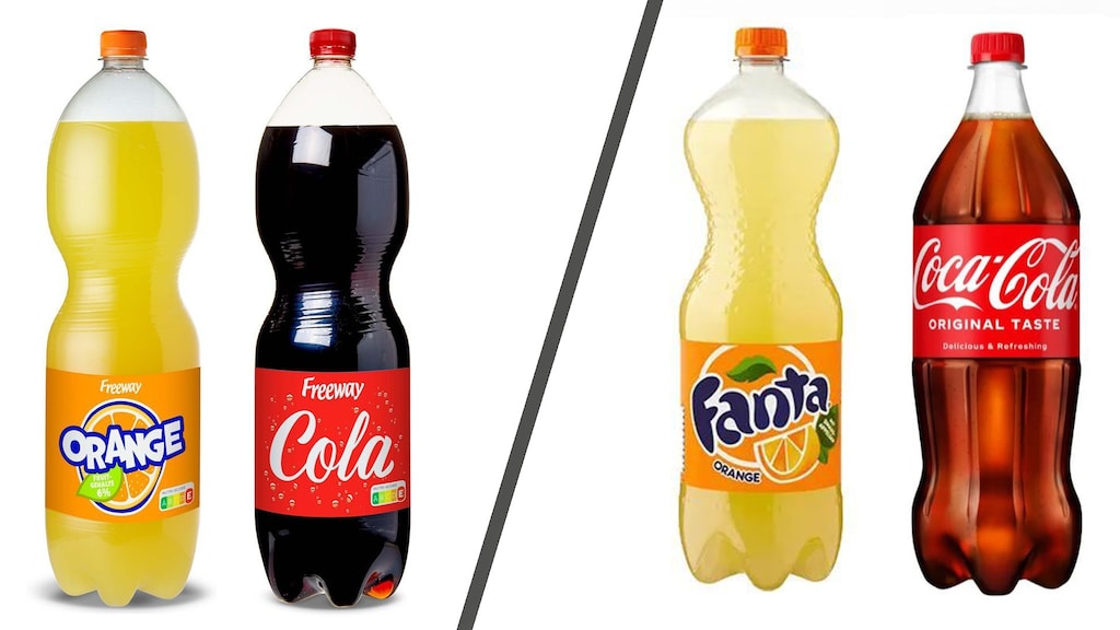 De frisdrank van de Lidl versus een fles Fanta en Coca-Cola: