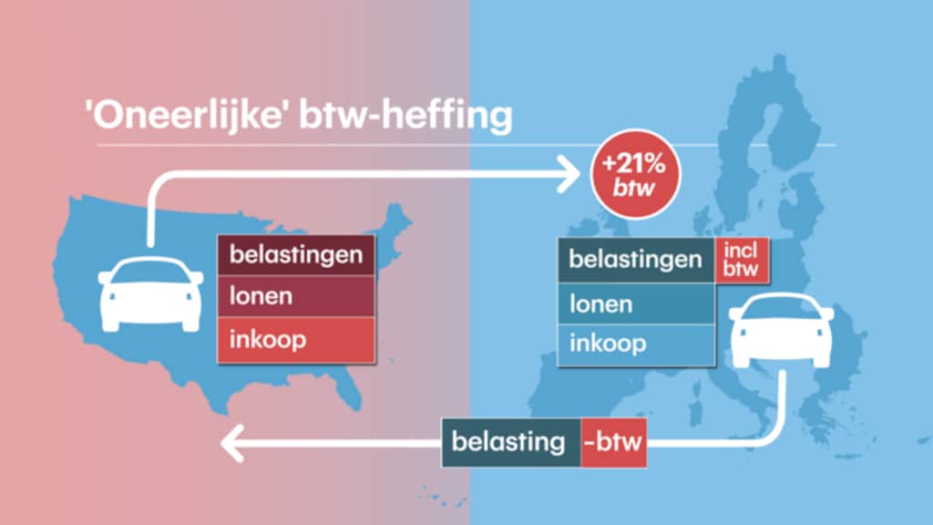 Als een automaker uit de EU exporteert, naar bijvoorbeeld de VS, dan kan deze automaker de btw (het rode blokje) terugvragen. Daardoor wordt in de ogen van Trump de kostprijs van een autoproducent uit de EU lager. Een automaker uit de VS kan de sales tax niet terugvragen, waardoor volgens Trump concurrenten uit de EU een voordeel hebben.