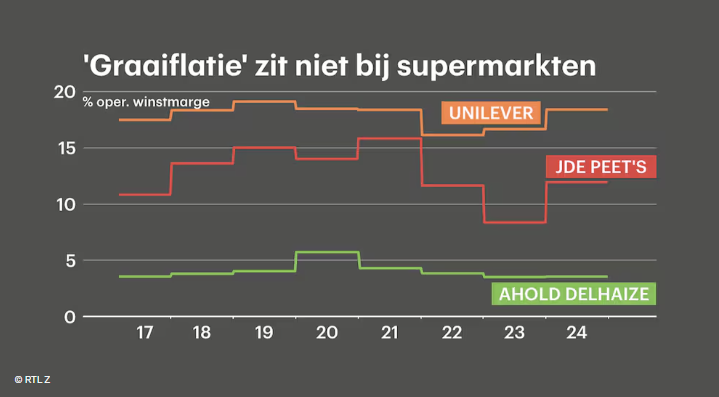"Het koffiebedrijf wint en de supers lijden de pijn", zei beurscommentator Durk Veenstra vorige week al. De winstmarges zitten bij de leveranciers van de A-merken, zo zie je in onderstaande grafiek. En dus niet bij de supermarktbedrijven. "Die moeten op een houtje bijten."