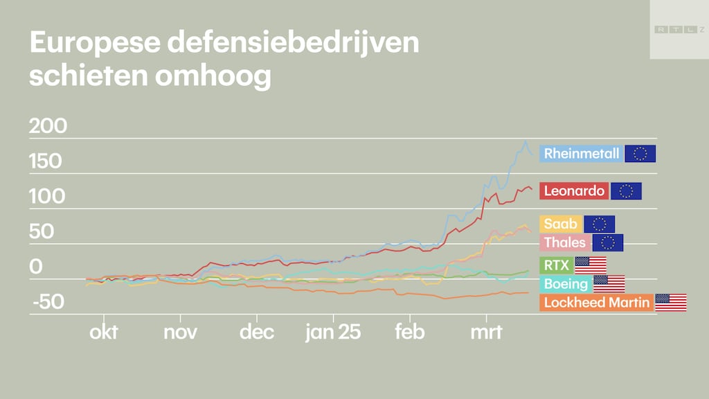 Wat opvalt is dat de grote Amerikaanse bedrijven op defensiegebied het veel minder goed doen. Niet zo gek, want de grote investeringen lijken dus niet - of maar ten dele -in Amerika terecht te komen. Landen als Canada en Portugal twijfelen inmiddels zelfs openlijk over het aankopen van Amerikaanse F35-straaljagers, omdat ze de Amerikanen niet vertrouwen op dit moment.