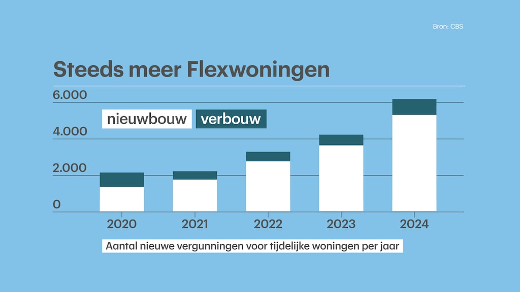 Opvallend is dat er steeds meer flexwoningen bijkomen in bestaande gebouwen, ziet het CBS. Dan gaat het vooral om oude kantoorpanden die worden omgebouwd zodat zij geschikt zijn voor tijdelijke bewoning.