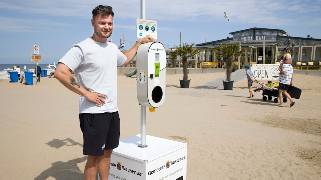 Uit een paal/dispenser komt een afgemeten hoeveelheid zonnebrand als de hand eronder wordt gehouden. De paal krijgt stroom door zonnepanelen.