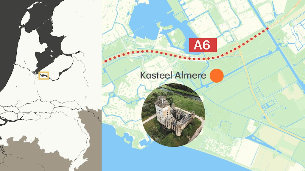 De bekende kasteelruïne langs snelweg A6 bij Almere wordt afgebouwd, rondom het pand komt een woonwijk met 800 tot 1000 nieuwbouwwoningen. 25 jaar nadat de bouw van het kasteel begon, krijgt Almere eindelijk z'n bijzondere trouwlocatie.