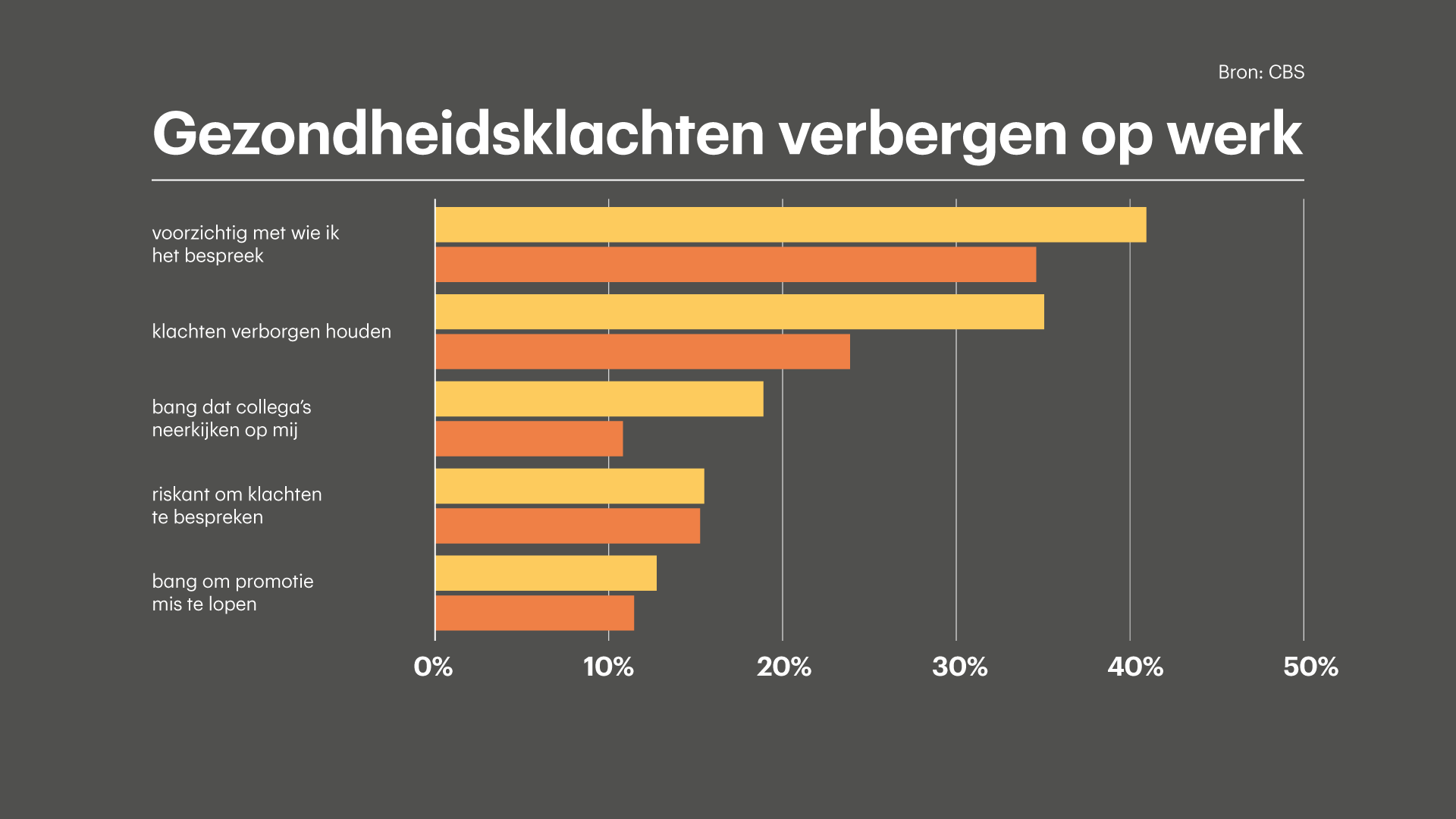 In die gevallen verzwijgt 24 procent hun klachten voor collega’s, zo leest een vervolgmeting van het Centraal Bureau voor de Statistiek (CBS), TNO en de Nationale Enquête Arbeidsomstandigheden (NEA).