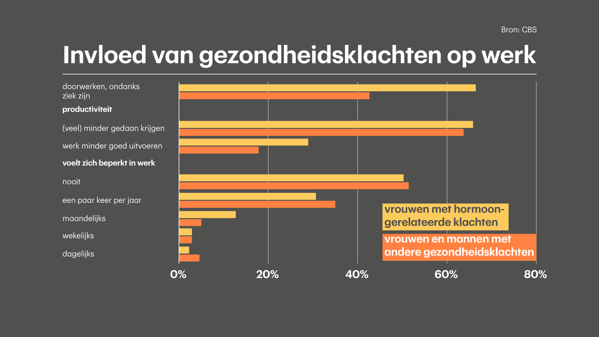 In de onderstaande grafiek zie je dat vrouwen met hormoongerelateerde klachten vaker doorwerken als ze zich ziek voelen dan mannen en vrouwen die last hebben van andere gezondheidsklachten.
