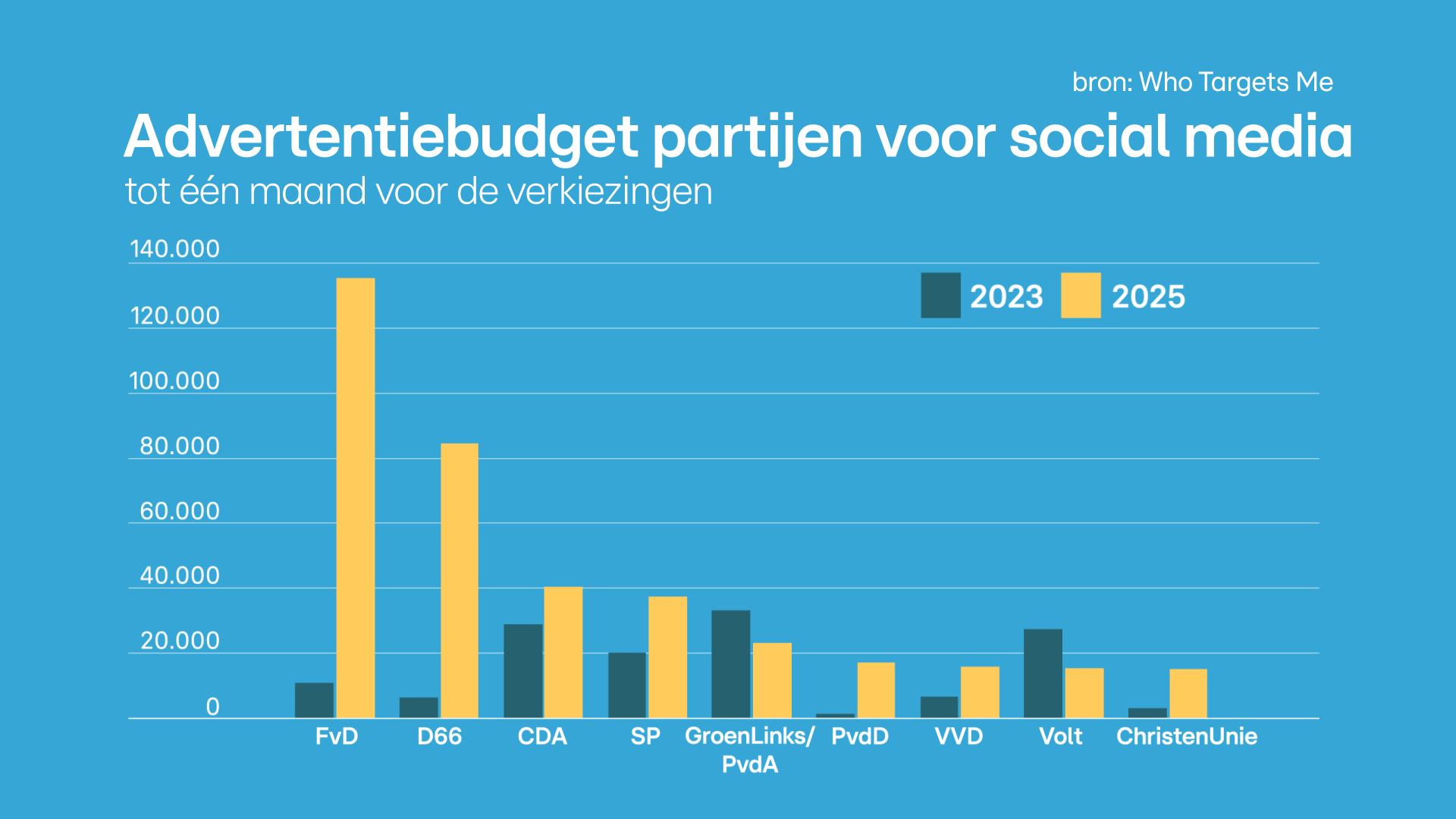 In totaal bedroegen de socialmedia-budgetten bij de verkiezingen in 2023 ruim 2,5 miljoen euro. De uitgaven liepen kort voor de verkiezingen flink op: de helft van dat bedrag werd in de laatste week voor de verkiezingen uitgegeven.
