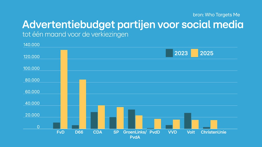 Op afstand volgt D66, dat bijna 85.000 euro spendeerde. Daarachter volgen het CDA en de SP die elk zo'n 40.000 euro uitgaven. Opvallend is dat sommige partijen juist mínder uitgeven aan social advertenties, zoals GroenLinks-PvdA en Volt.