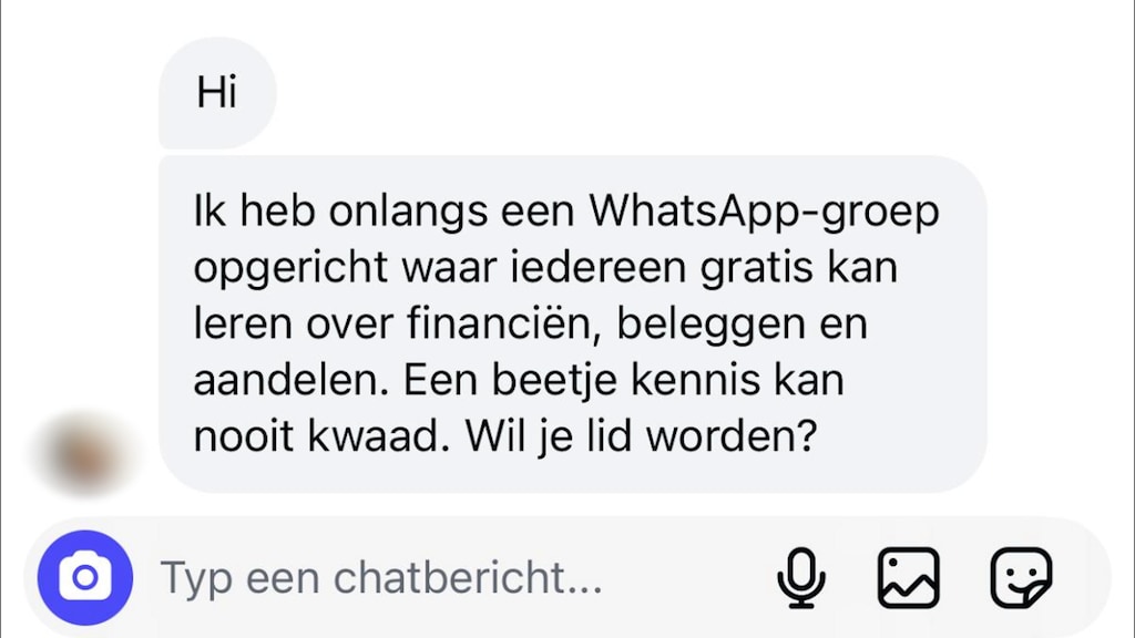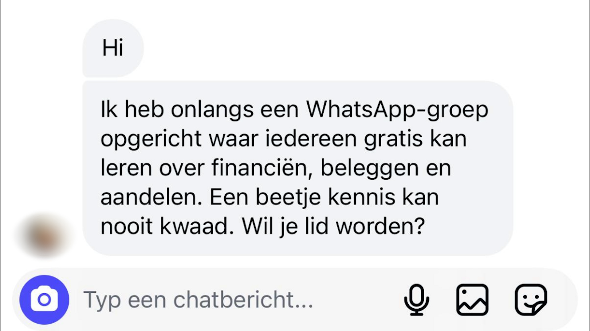 Misschien herken je het wel, via Whatsapp wordt je plots toegevoegd aan een chatgroep. Ook worden consumenten via valse advertenties gelokt naar dit soort groepen. Dat gebeurt uit naam van bekende mensen uit de beleggingswereld of financiële journalistiek die gratis beleggingsadvies aanbieden. Maar in werkelijkheid zijn het nepaccounts.