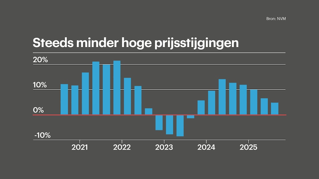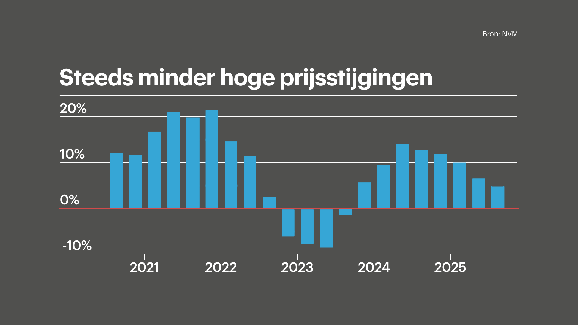Ten opzichte van vorig jaar is er nog wel een flinke prijsstijging, 4,8 procent, maar veel minder dan de dubbele cijfers die begin dit jaar nog in de boeken werden gezet. Dit is onder meer te merken aan de afnemende drukte tijdens bezichtigingen en de langere verkooptijd van huizen, die is inmiddels opgelopen naar gemiddeld 29 dagen.