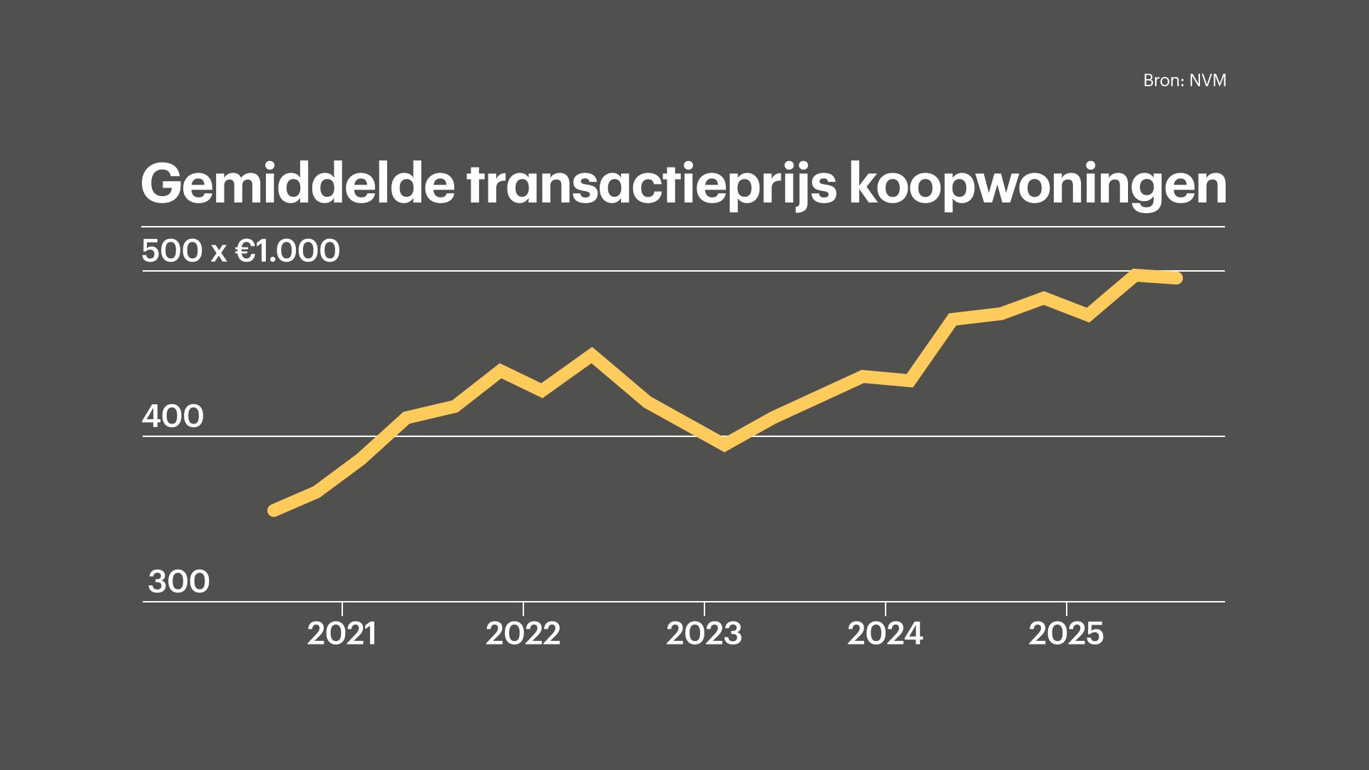 In het derde kwartaal van 2025 lag de gemiddelde verkoopprijs op ongeveer 491.000 euro, een stijging van 5 procent ten opzichte van een jaar eerder. Die stijging geldt vooral voor grondgebonden woningen, zoals tussenwoningen en vrijstaande huizen. De prijzen van nieuwe appartementen blijven al jaren ongeveer gelijk.