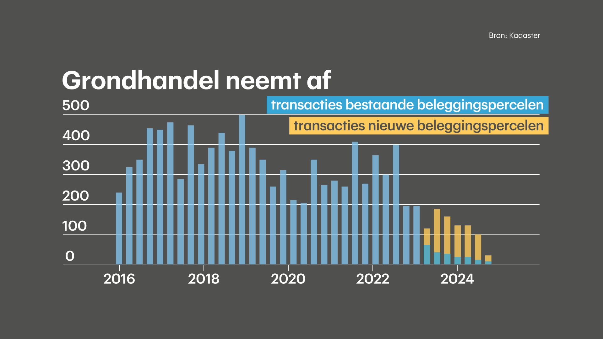 Opvallend is dat er sinds 2023 veel minder weilanden worden opgeknipt ten behoeve van grondhandel. Volgens het Kadaster hangt dit waarschijnlijk samen met de publicatie van de verhalen van slachtoffers in diverse media, zoals RTL Nieuws en het Financieele Dagblad.