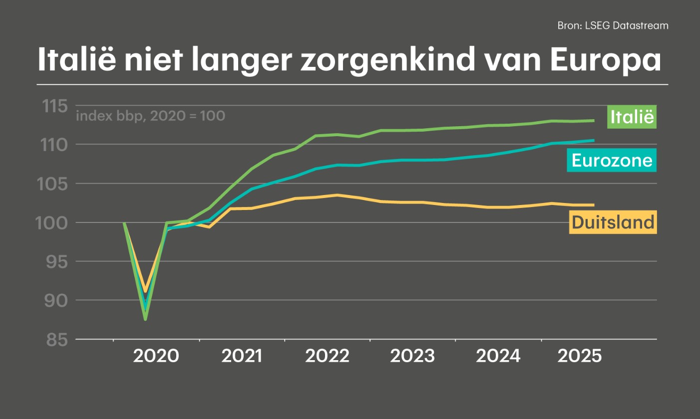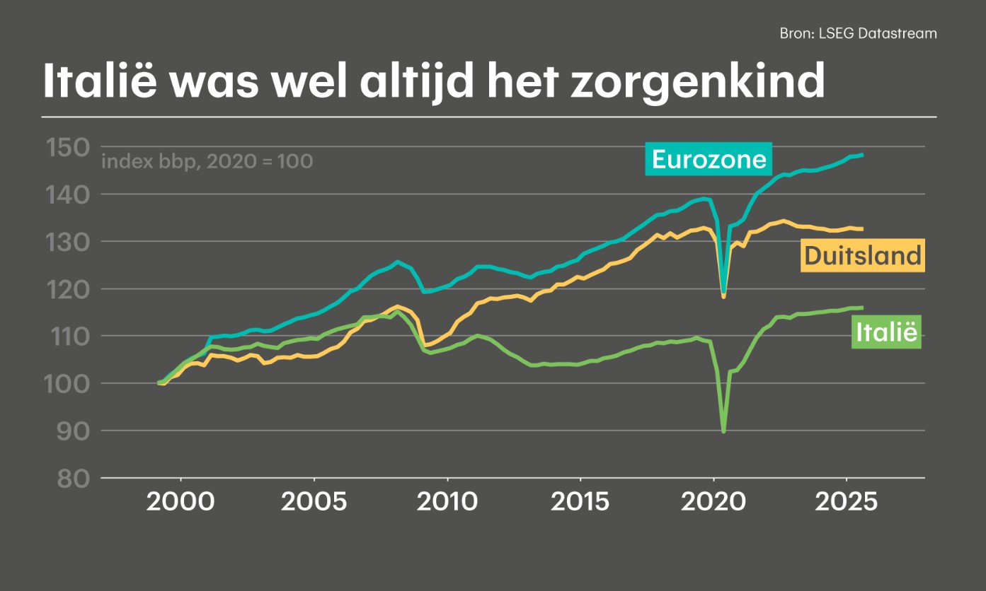 We hoeven ons nu minder zorgen te maken over de Italiaanse economie, zegt Veenstra. "Het land presteert economisch behoorlijk goed en is politiek gezien behoorlijk stabiel, onder premie Meloni, die er al zo'n drie jaar zit."