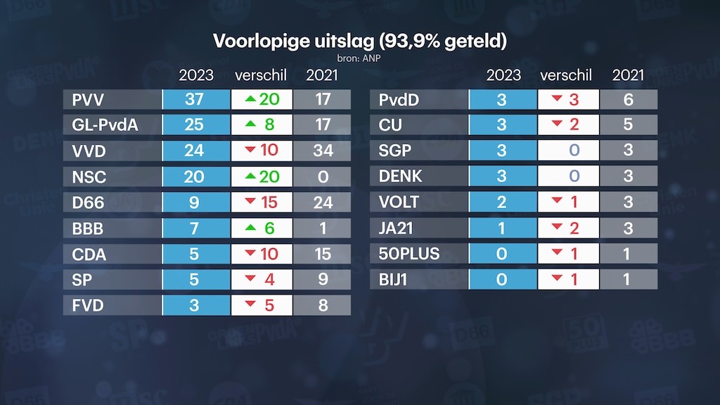 "Want met niet alleen 35 zetels voor de PVV, maar ook 24 zetels voor de VVD, 20 zetels voor NSC, 7 voor BBB, 3 voor FvD en 1 voor JA21 worden 90 van de 150 zetels in de Tweede Kamer bezet door conservatieven. Zo rechts is het parlement lang niet geweest."