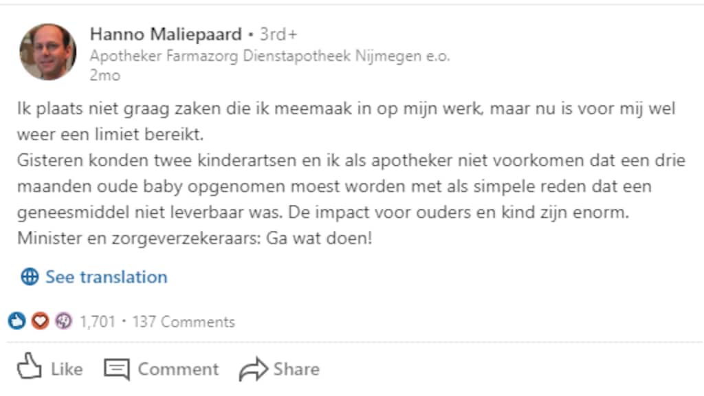 Uit frustratie zette de apotheker begin mei onderstaand bericht op LinkedIn. Het werd honderden keren gedeeld.