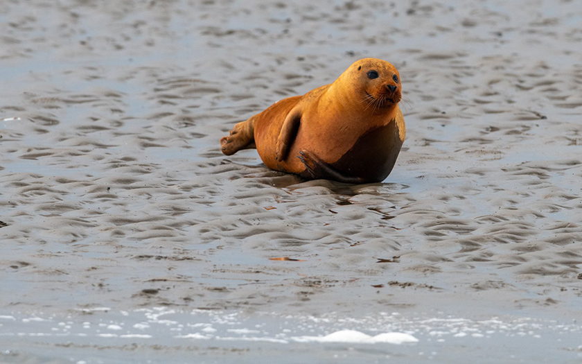 Het is een opvallend gezicht: een oranje zeehond. Het beestje werd afgelopen week gespot in de Waddenzee bij het Noord-Hollandse Wieringen.
