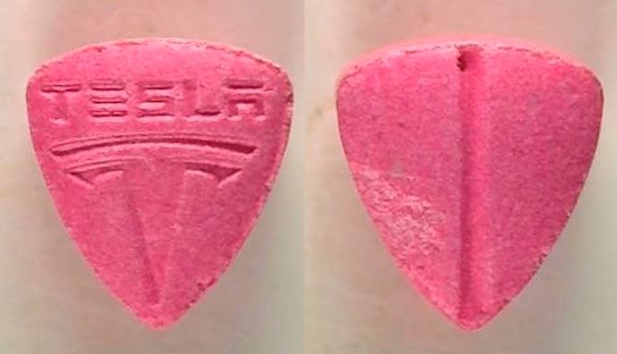 "Het betreft donkerroze, driehoekvormige pillen met een Tesla-logo. Na analyse bleken deze pillen geen 2C-B, maar het langwerkende tripmiddel DOC te bevatten. Vervolgonderzoek heeft uitgewezen dat het om een zeer hoge dosis gaat."
