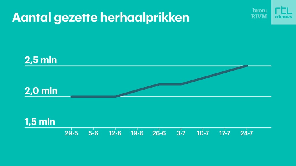 In de grafiek hieronder zie je dat het aantal gezette herhaalprikken de laatste weken met 75.000 tot 100.000 stijgt.