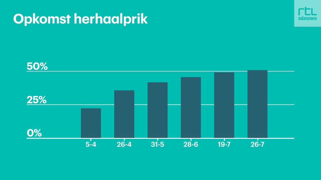 In totaal zijn nu 2,5 miljoen herhaalprikken gezet, dat is een opkomst van 50,9 procent (eind juli).