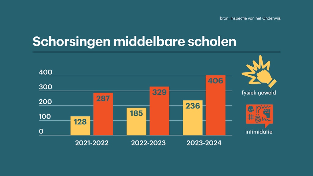 Een docent die thuis een baksteen door de ruit krijgt. Een leerling die een ijzeren staaf naar een leraar gooit. Docenten die letterlijk in de hoek worden gedreven, onder bedreiging van een mes. Het zijn excessen, maar ze staan voor een bredere ontwikkeling. Uit cijfers van de Onderwijsinpectie blijkt dat in het schooljaar 2023/2024 236 leerlingen zijn geschorst of van school gestuurd na geweld tegen een docent. Dat is een stijging van 28 procent ten opzichte van het jaar ervoor. Schorsingen om bedreiging met geweld kwamen 406 keer voor - een toename van 23 procent.