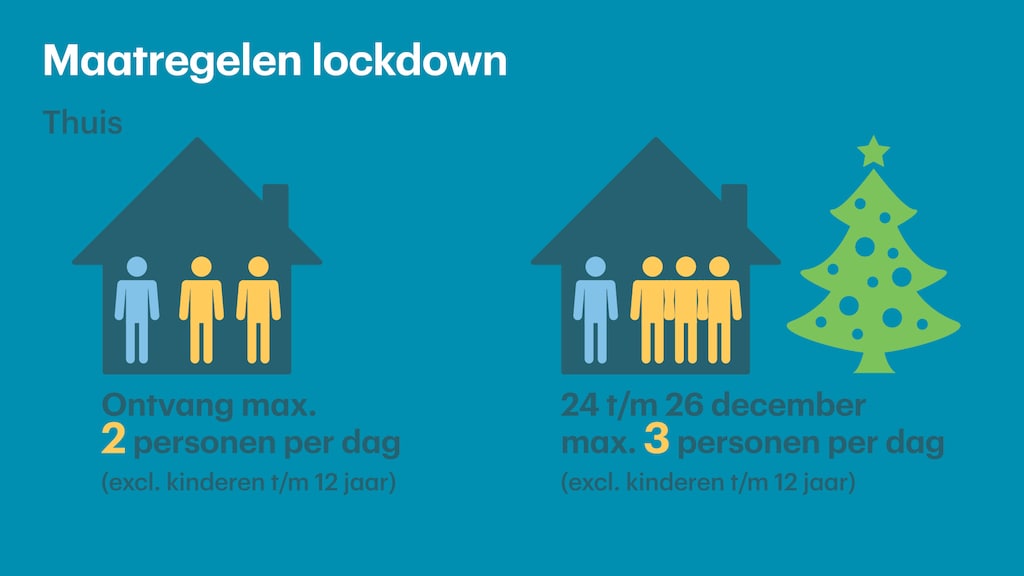 Nederland gaat vanaf morgen vijf weken lang op slot. Bijna alles gaat dicht, inclusief de scholen en niet-essentiële winkels. Er mogen nog maar maximaal twee mensen op bezoek komen. Voor kerst geldt een uitzondering: dan mogen drie mensen op bezoek komen. Dat geldt niet voor oud en nieuw. Een overzicht van de maatregelen die tot en met 19 januari duren.