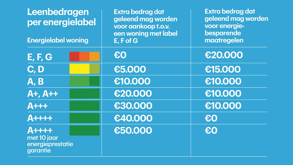 Ook aan bestaande woningbezitters die een groener energielabel willen is gedacht in de nieuwe richtlijnen. Daarbij geldt het omgekeerde: hoe lager het label, hoe meer je extra mag lenen bovenop je hypotheek om je huis op te knappen.