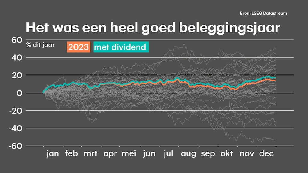 Maar 2023 was dus een goed jaar voor beleggers in aandelen. Als je het dividend meetelde dan werd je met een belegging in de AEX-index zelfs ruim 17 procent rijker. Dat is veel meer dan de paar procent die je op een spaarrekening krijgt.