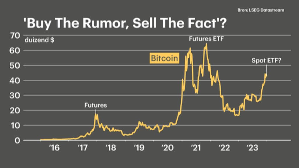 Zelfs als die toelating er komt, dan nog is het de vraag wat dat zal betekenen voor de koers, zegt hij. In het verleden waren zulke momenten vaak reden voor uitverkoop, blijkt uit onderstaande grafiek.