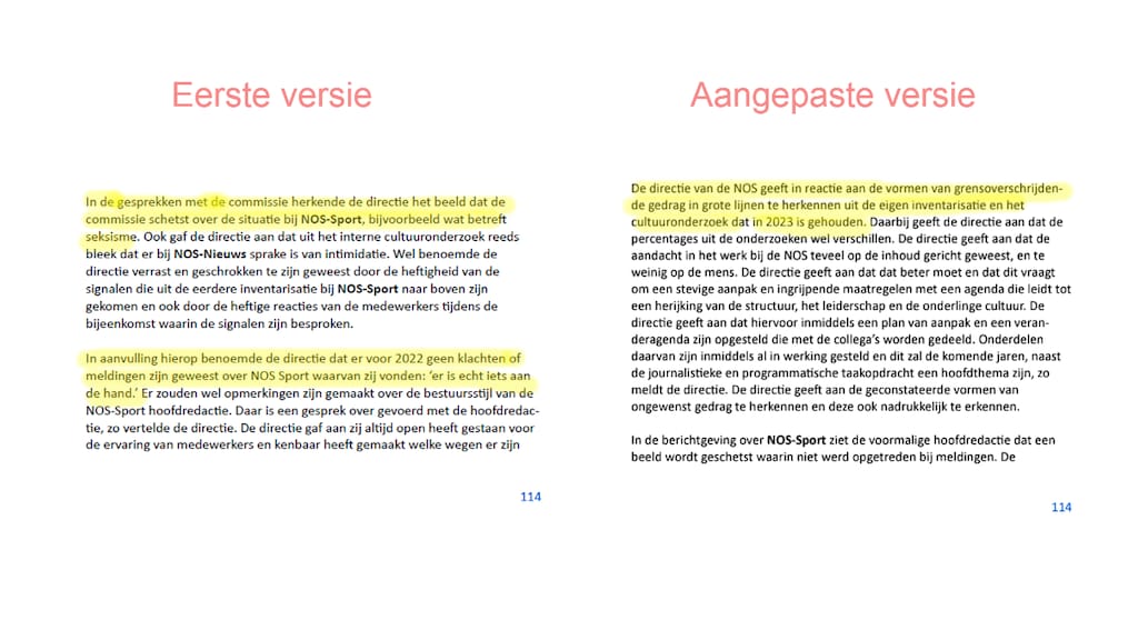 In de conceptversie van het rapport staat dat de directie het beeld dat de commissie schetst over de situatie bij NOS Sport 'herkende'. Dat is in de nieuwste versie aangepast naar 'in grote lijnen herkennen'. In dezelfde alinea is de zin geschrapt dat de directie 'verrast en geschrokken' was van de signalen uit het eigen onderzoek.