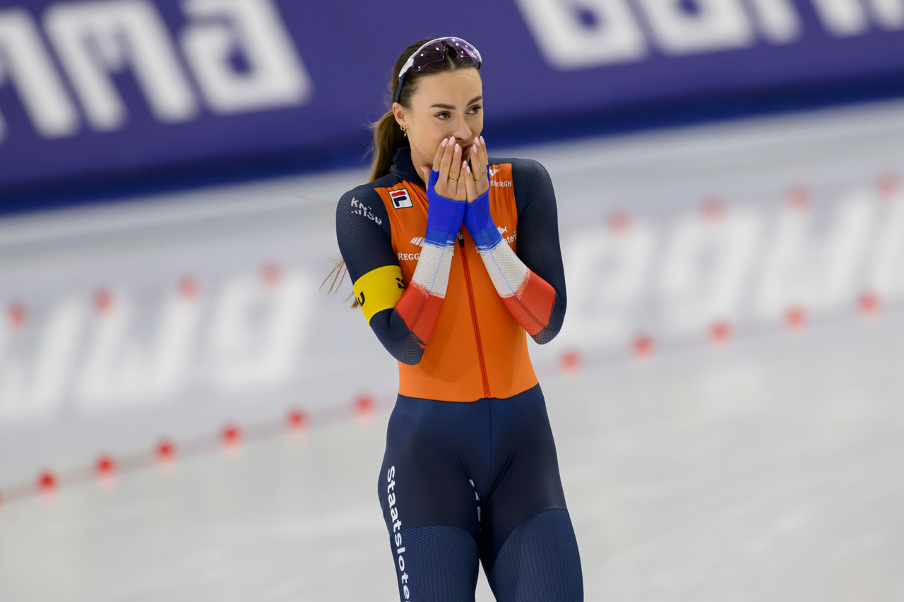 Femke Kok moest toch even een traan laten toen ze over de finish kwam. Handen voor de ogen, in de lucht, en dan weer voor de ogen. Haar vader, René Kok, zat thuis in het Friese Nije Beets. Daar zag hij hoe zijn dochter de snelste ter wereld werd.